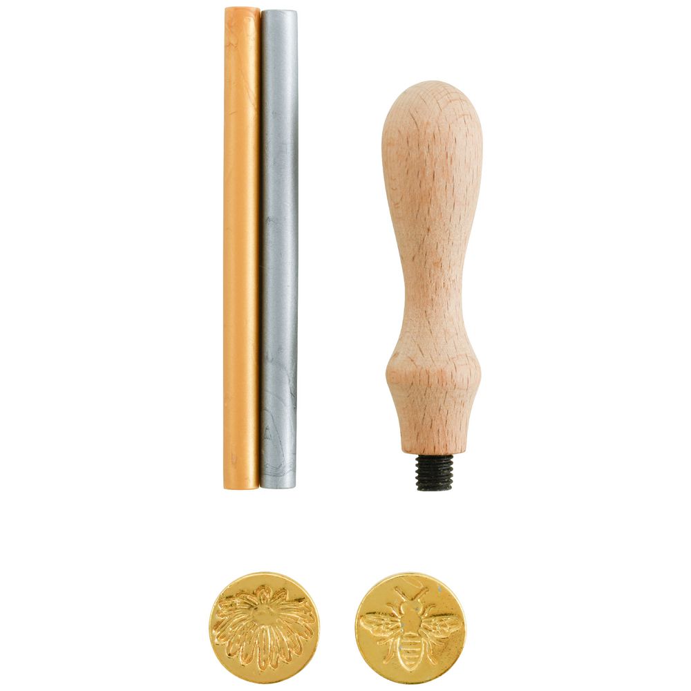 - This kit includes: 1 x stamp handle, 2 x stamp designs, 1 x gold wax stick and 1 silver wax stick.