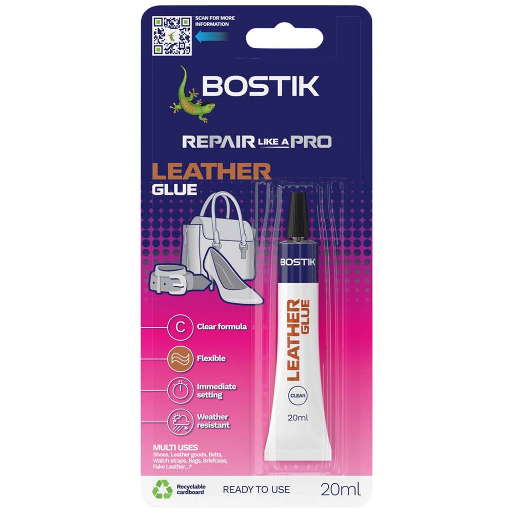 This Bostik Leather Repair Clear Glue is an ultra strong, quick drying, water resistant, clear adhesive. It's ideal for making long lasting repairs to leather or imitation leather items such as shoes, belts or bags. It's also suitable for use on PVC.
