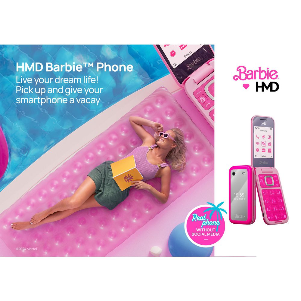 Embrace the digital detox in style with the Barbie⢠themed flip phone from HMD. This 4G flip phone is a nostalgic piece of tech with the ability to call, text and even play the legendary mobile game snake, with a fun Barbie⢠Malibu theme of course. Plus, this phone is jam packed full of fun easter eggs and design quirks that will entertain any Barbie fan for hours on end.