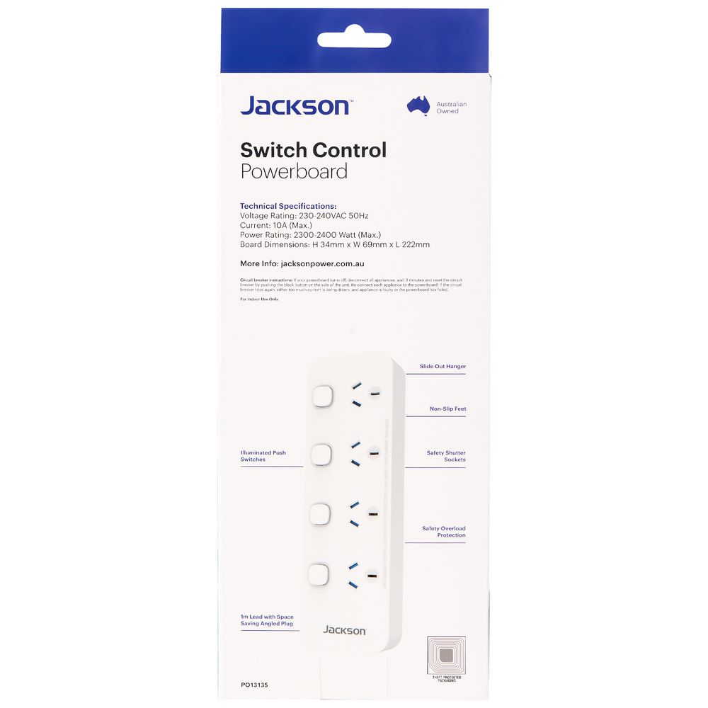 This Jackson 4 Outlet Overload Switched Powerboard is ideal for use in your home or workspace, instantly expanding your power capacity. Each outlet is individually switched, allowing you to choose which appliances you want to be on and switching off the ones you don't. This powerboard features Safety Overload Protection, protecting your equipment from overheating and tripping the power for added peace of mind.