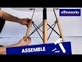 - It has a white surface with a powdercoated black frame and natural wood legs.