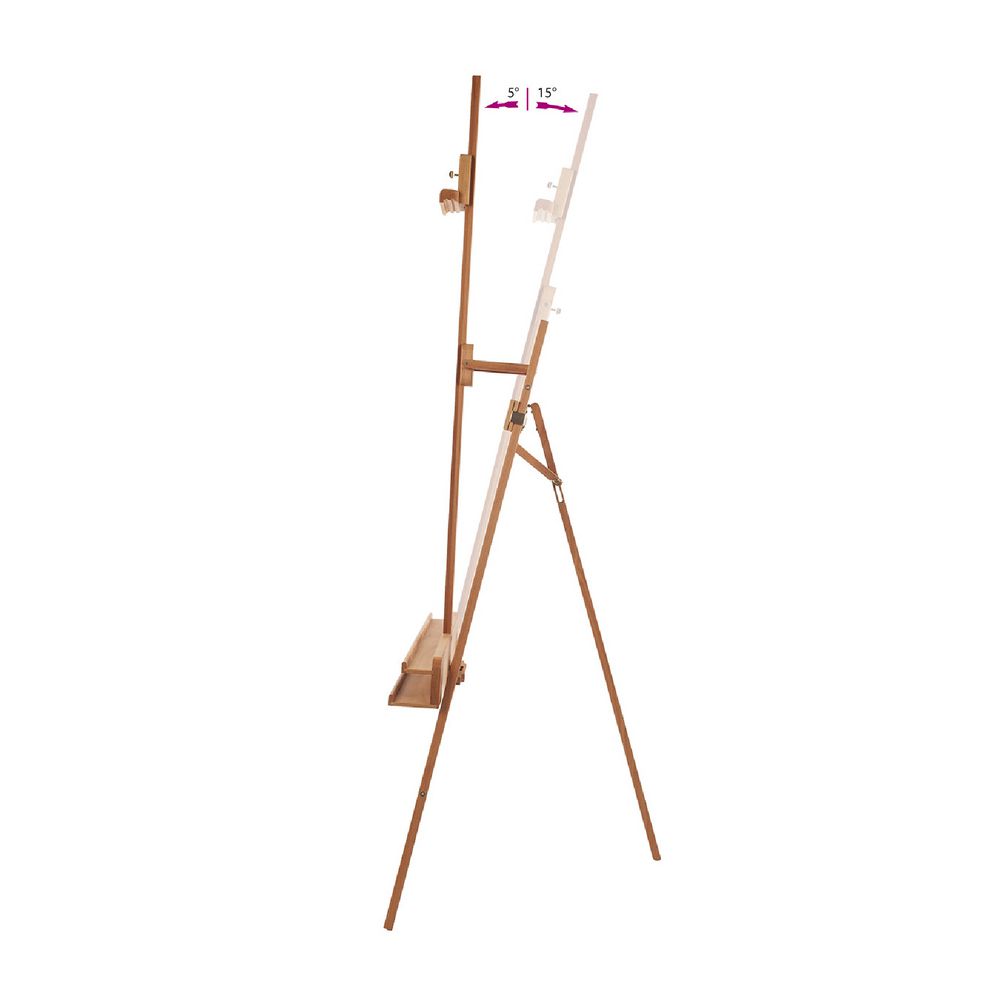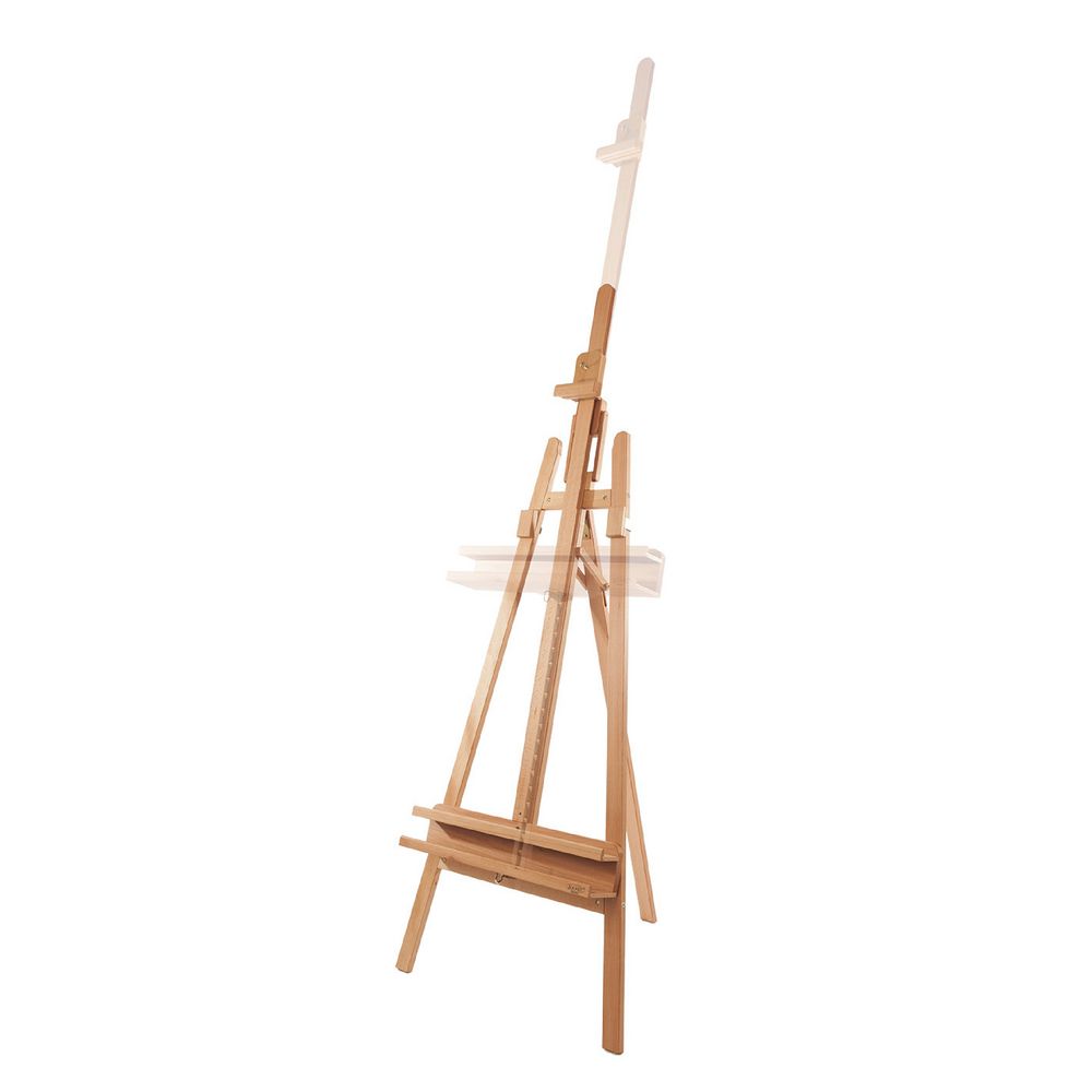 This MABEF Inclinable Lyre Easel features oiled, stain-resistant beech wood that is FSC-certified. The adjustable canvas holder and mast make it ideal for canvases up to 125 cm high. It features an anti-vibration inner spring, comes with additional sliding canvas supports, and has a convenient storage shelf.