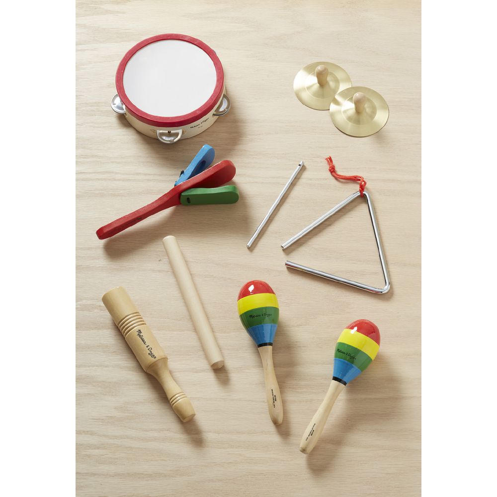 - This set includes a tambourine, cymbals, maracas, clacker, tone blocks and a triangle.