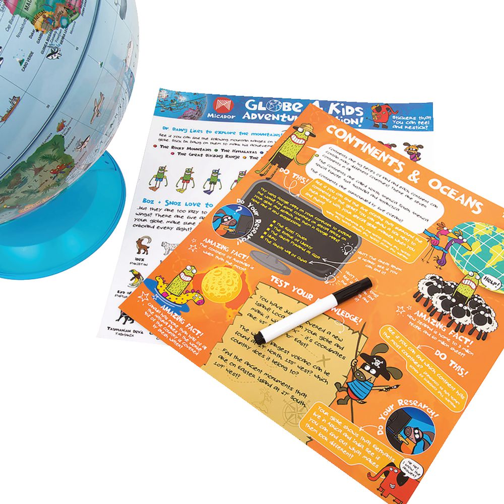 This Micador jR Globe measures 30 cm in diameter and is a great learning tool for keeping at home or in the classroom. It comes with an activity sheet for learning, stickers to place and reapply and a non-permanent marker.