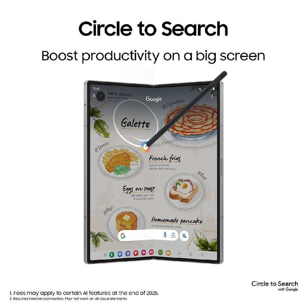 • "¹Fees may apply for AI features after 2025. Certain AI features require Samsung and Google Account. Internet connection may be required. AI Features will be provided free of charge until the end of 2025 on supported devices.