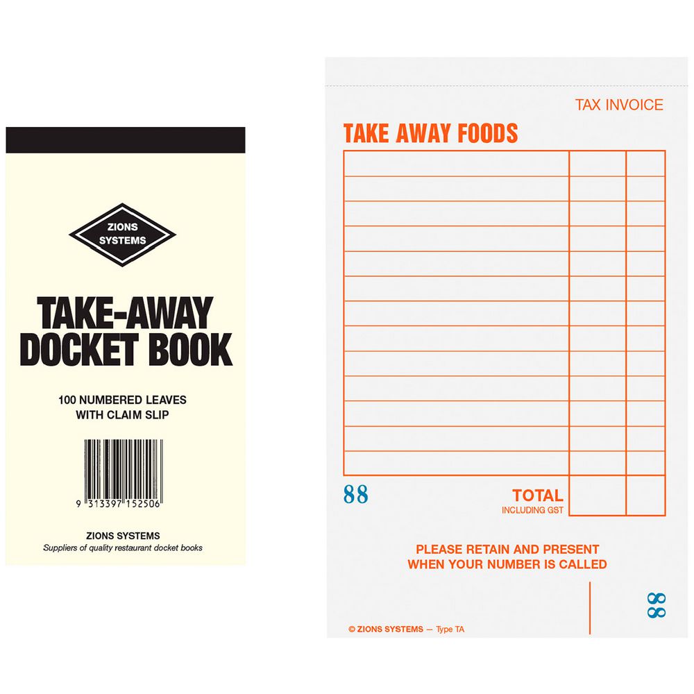 This Zions Take Away Docket Book is a great way to record order information accurately. The pages are perforated so that you can easily tear them out. They are also numbered and have perforated slips at the bottom that you can give them to customers to use as claim receipts.